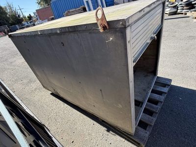 Heavy duty steel tool box designed for the back of a truck. Access from both sides with roller doors. Fitted with lifting anchors for easy placement onto a truck.