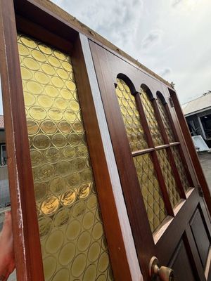 Solid timber front door with stained opaque glass panel, in good condition and ready for reuse.
